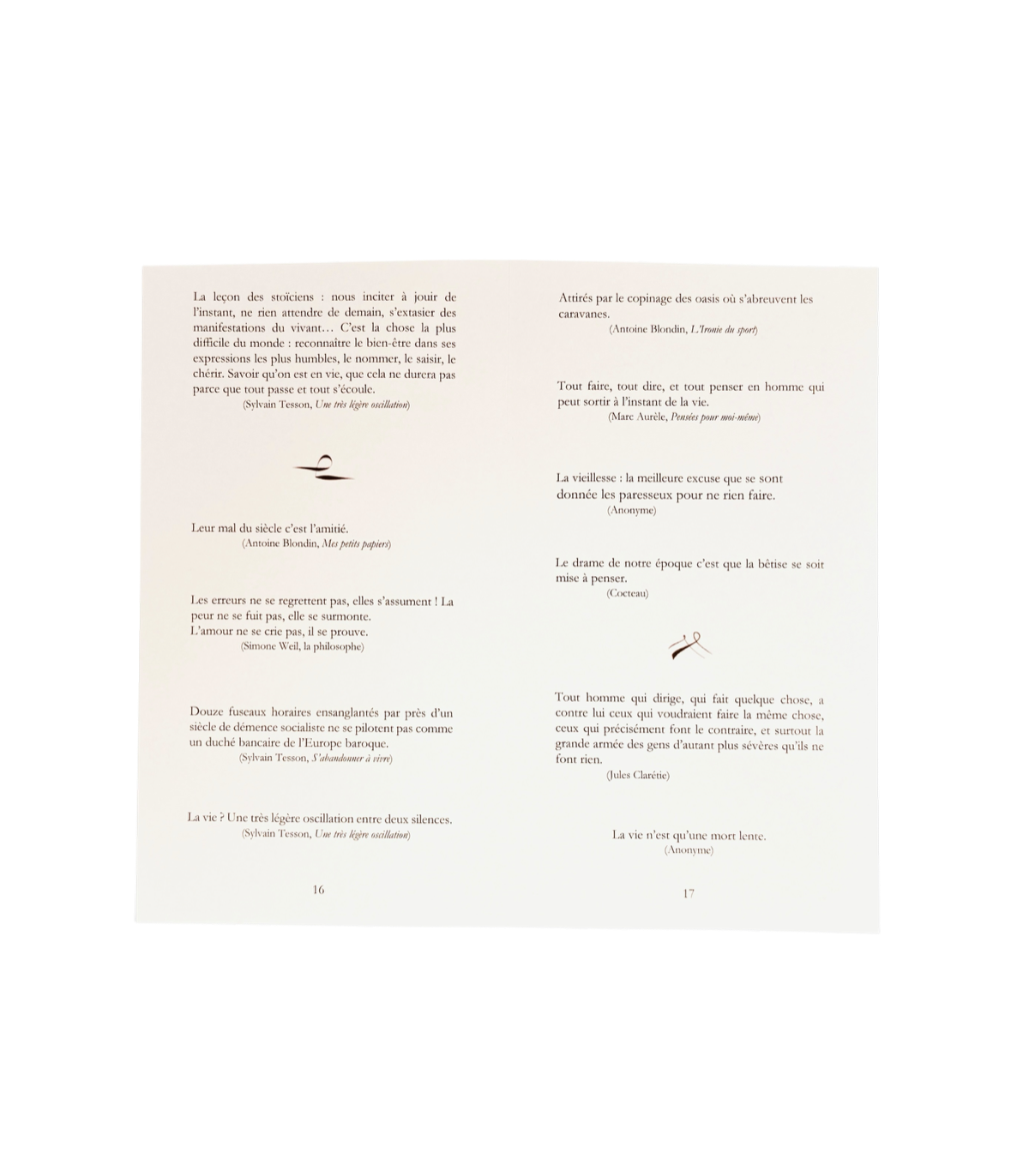Edition originale de ce recueil réunissant 150 citations relevées par Jean-Hugues O'Neill au fil de ses lectures chez 97 écrivains, offrant un étonnant panorama de la pensée à travers les siècles, sur des sujets très divers, depuis un verset de l'Evangile de saint Luc jusqu'aux écrivains contemporains. Citons entre autres: saint Mathieu, Montesquieu, Pascal, La Fontaine, Balzac, Hugo, Péguy, Proust, Spinoza, Nietzsche, Wilde, Bergson, Colette, Guitry, Giono, Saint-Exupéry, Yourcenar, Zapata, Bernanos, Apollinaire, Morand, Bofa, Brassens, Ormesson, Déon, Kersauzon, Cheng, Ecco, Tesson… Tirage unique limité à 60 exemplaires numérotés sur papier Munken. Onzième volume de la Collection 164.