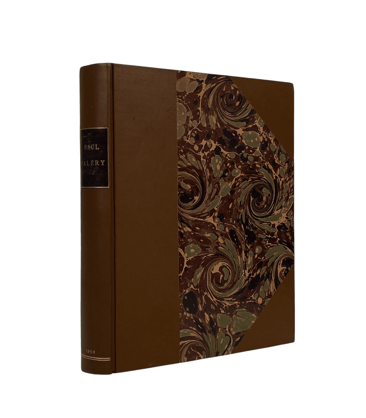 Grand in-8, bradel toile beige à coins, plats de papier marbré, pièce de titre en maroquin noir sur le dos; doublures et gardes de papier vergé, non rogné, couverture imprimée (Alfred Farez).